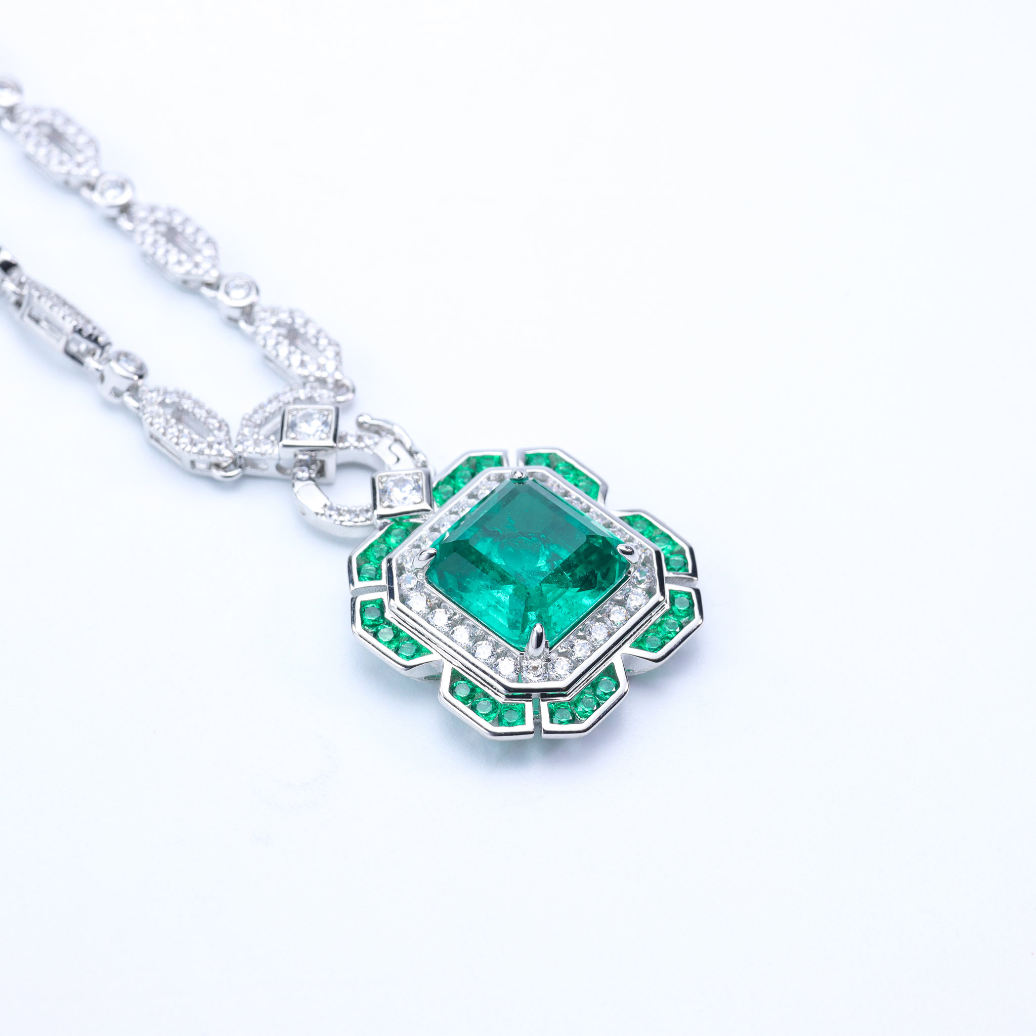 This luxurious necklace features a detachable art-deco–inspired pendant, pavé-set with sparkling cubic zirconia and a vivid lab-created emerald at the center. The rich deep-green stone is crafted with natural-style inclusions, giving it the depth and character of fine natural emerald, yet with the consistency and durability of a modern lab-grown gem.