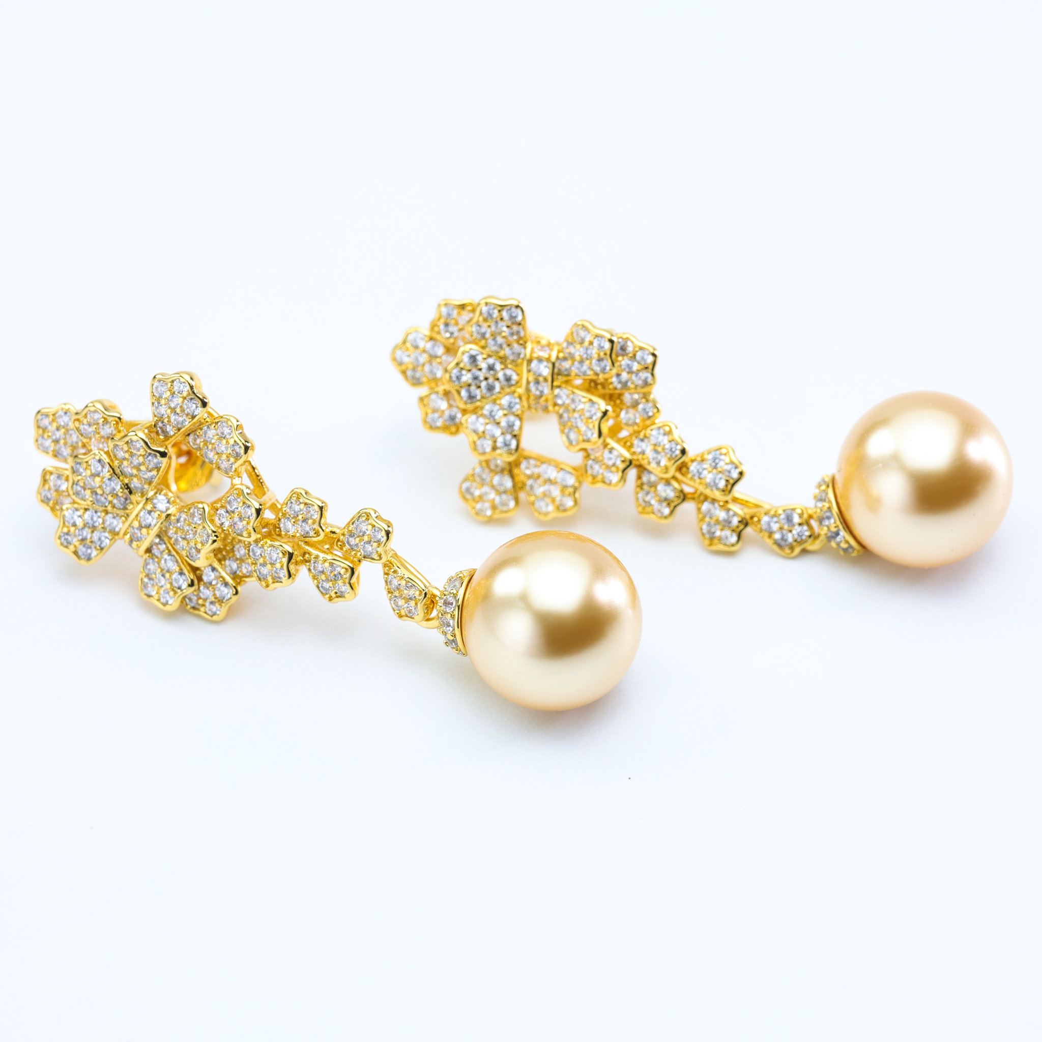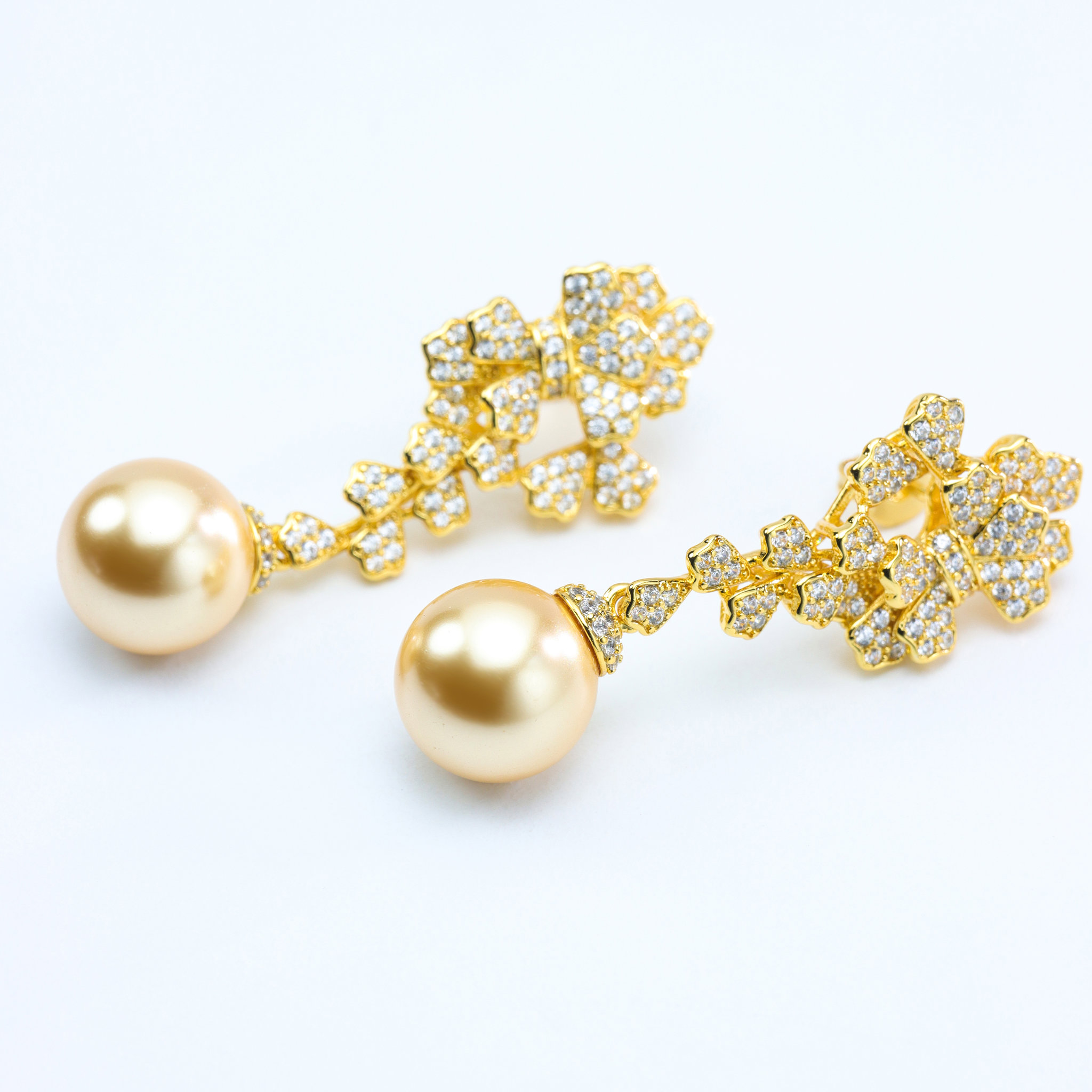 Suspended from each flower cluster is a round simulated South Sea golden pearl (approx. 10 mm), giving the earrings a luxurious, high-end look reminiscent of natural South Sea pearls but with excellent durability and consistency.