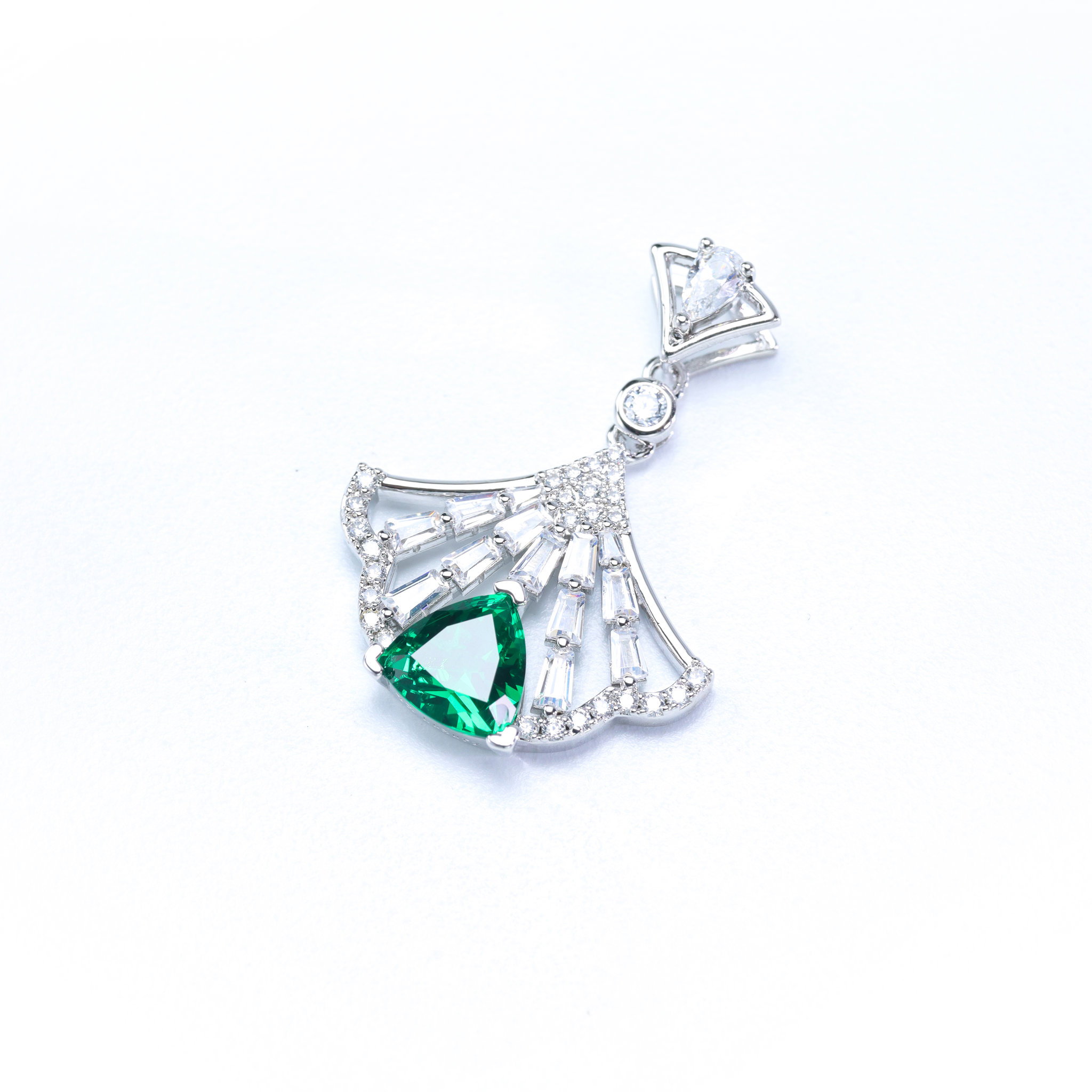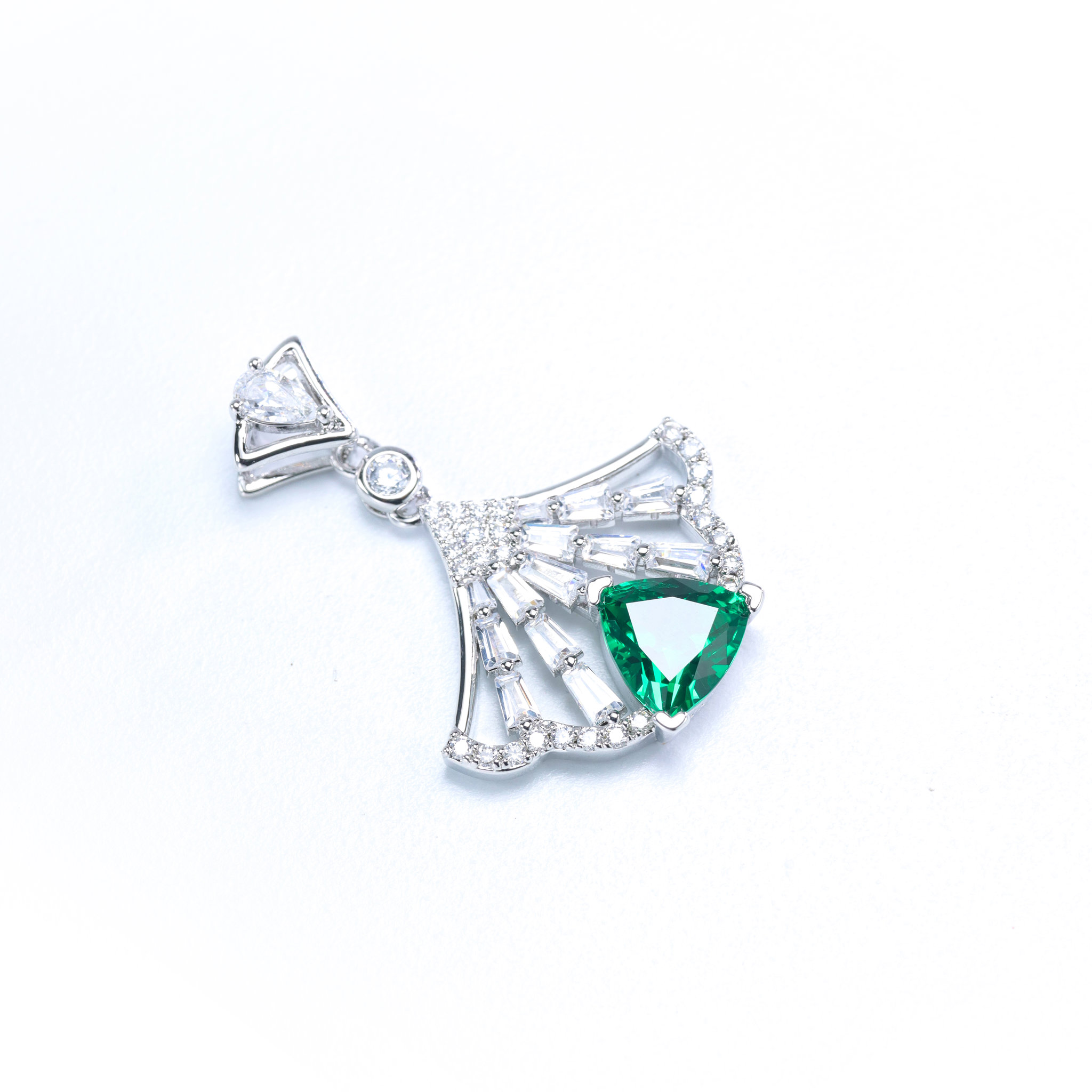 Elegant and playful, this pendant is designed in the shape of a flowing little dress or fan, radiating light with every movement. At the center sits a vivid deep green lab-created emerald in a unique trillion cut. The stone is crafted with natural-style inclusions, giving it the rich, organic look of fine natural emeralds while remaining more durable and affordable.