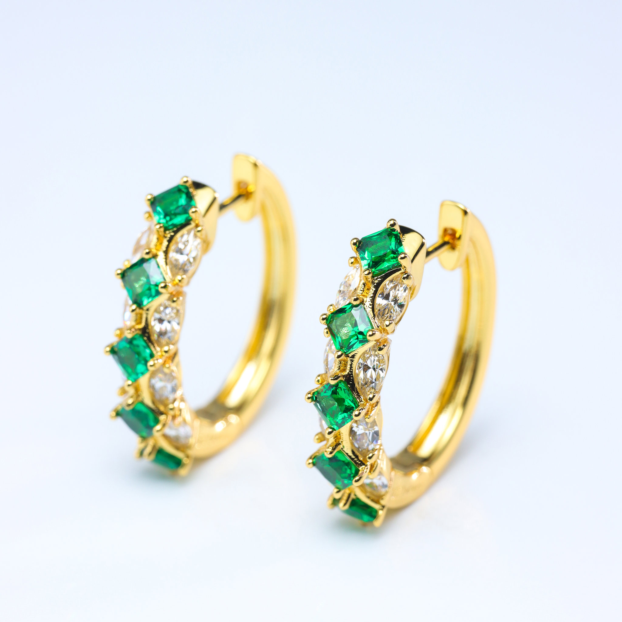 These chic hoop earrings bring a fresh pop of green to your everyday style. Crafted in 18K gold plated metal, each hoop is set with alternating brilliant white cubic zirconia and square-cut green simulated emeralds, creating a bright, colorful sparkle from every angle.
