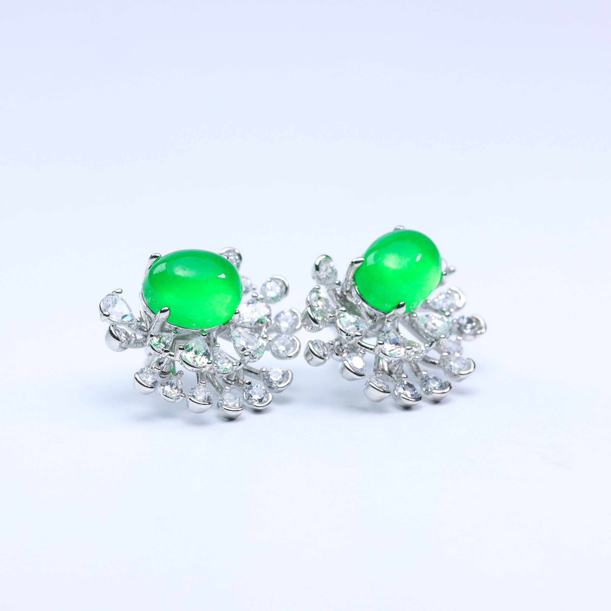 The smooth cabochon cut highlights the rich green color, while the surrounding stones catch the light beautifully, making these earrings eye-catching yet refined. Perfect for special occasions, evening outfits, or elevating everyday style.
