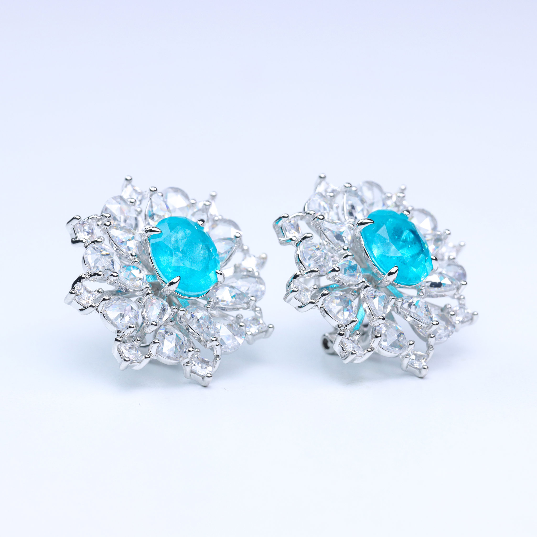 The center stone is specially crafted with natural-looking inclusions, making it look almost identical to genuine Paraiba tourmaline—bright, neon blue and full of depth and fire. Paired with the high-sparkle zirconia, these earrings shine beautifully from every angle and instantly elevate any outfit.