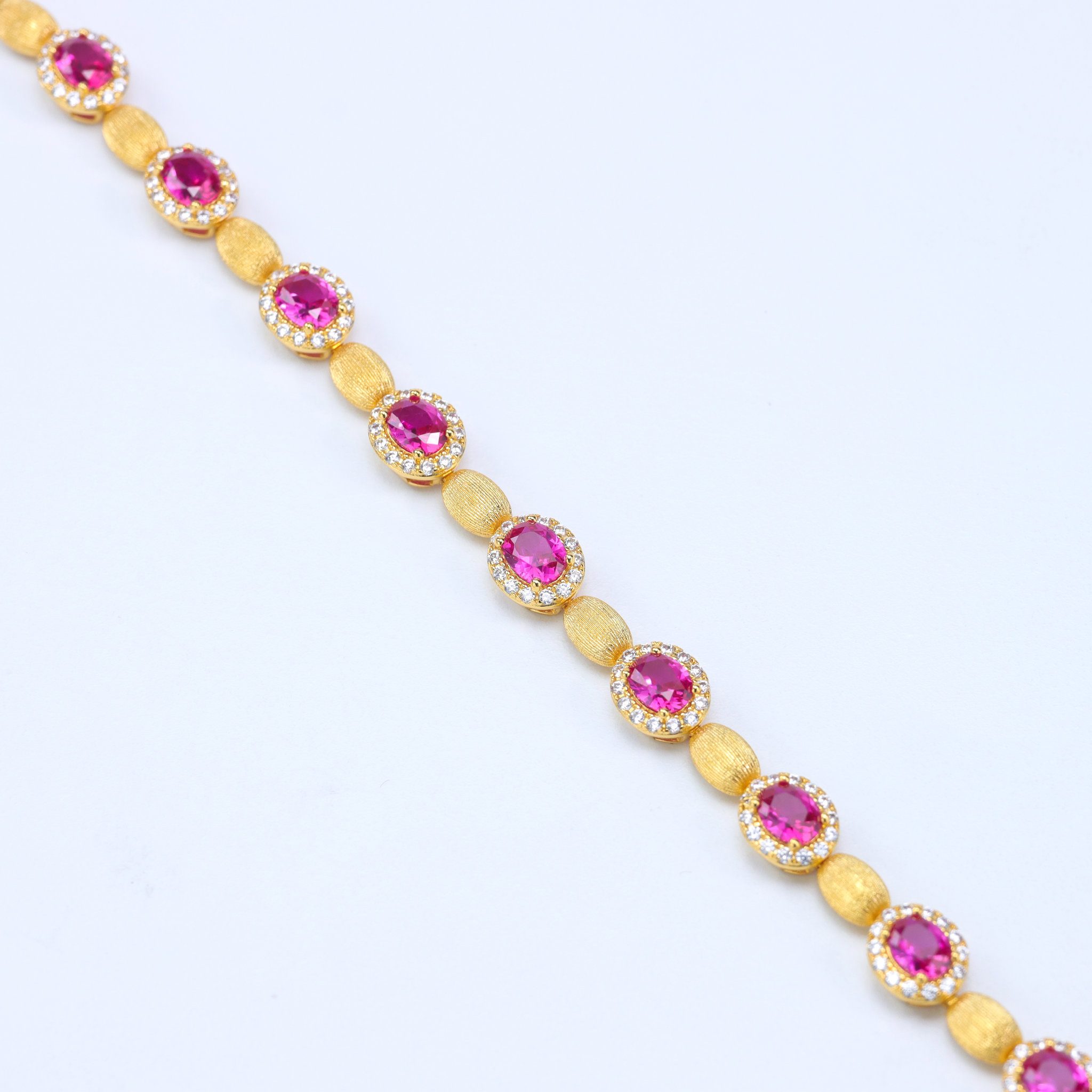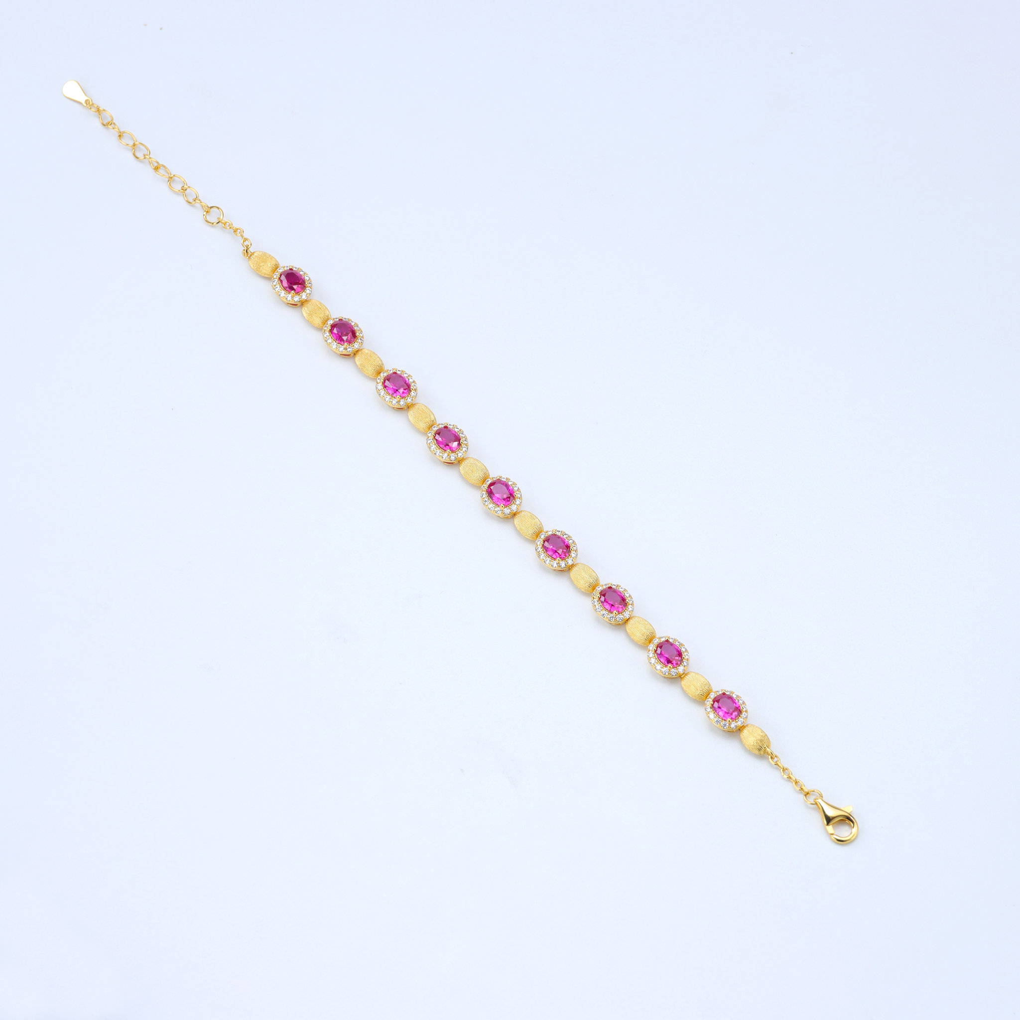 Add a vibrant pop of color to your wrist with this luxurious ruby tennis bracelet. Crafted with 18K gold plating, the design alternates between satin-finished oval links and sparkling halo settings.