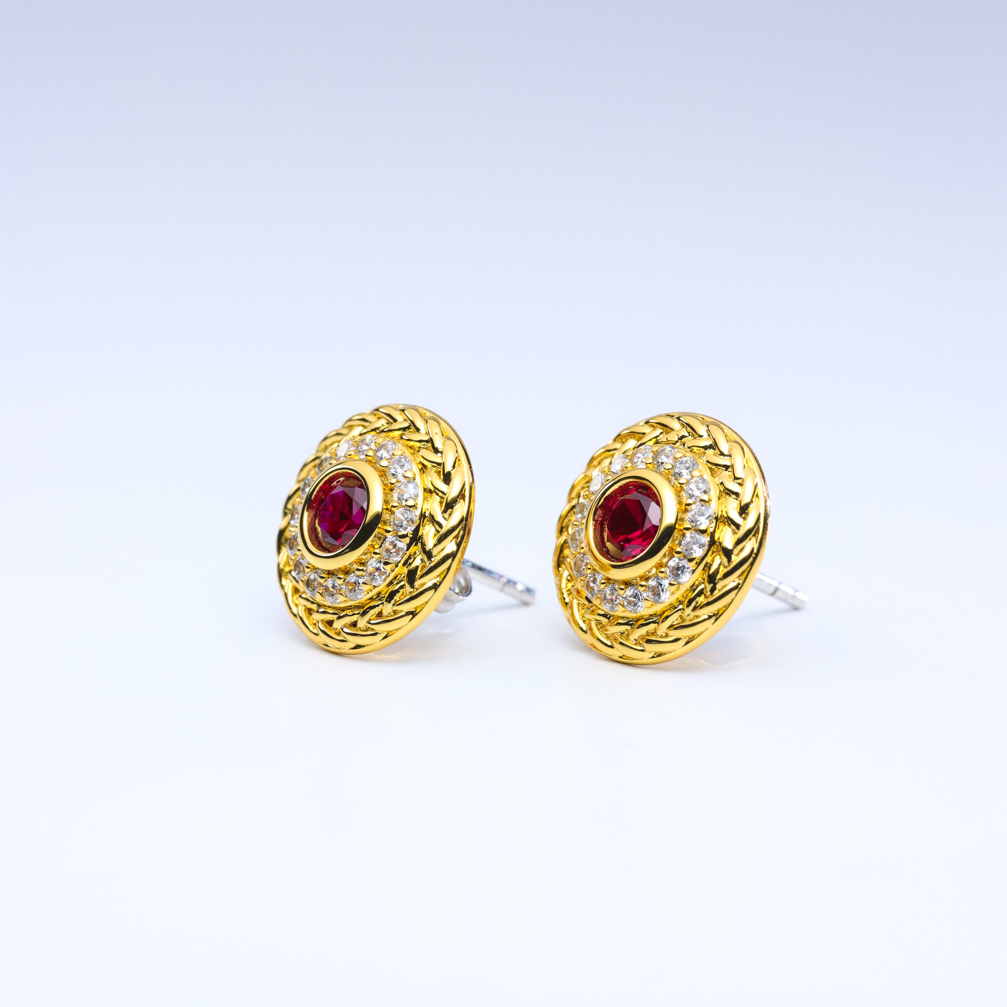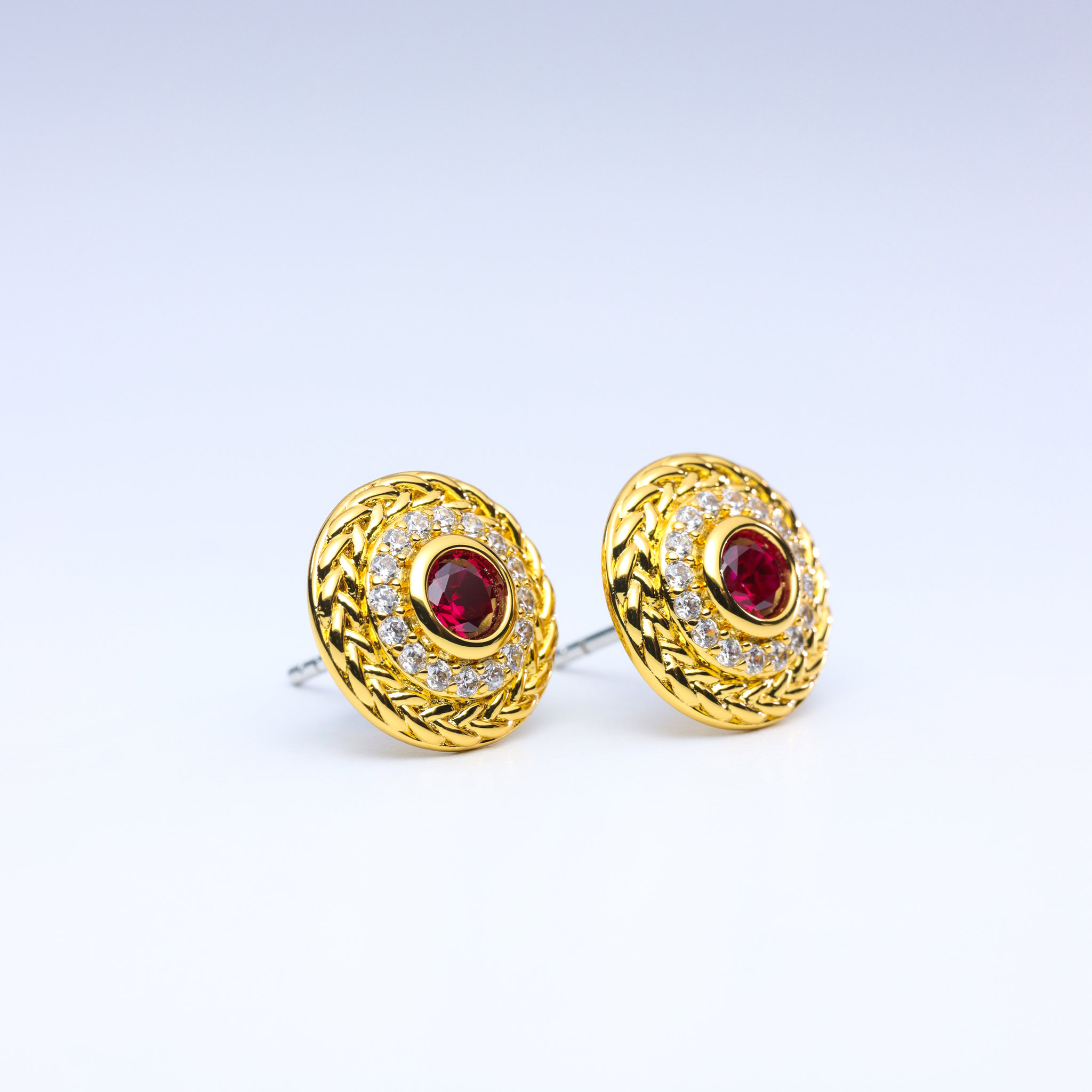 These classic round stud earrings bring together timeless elegance and vintage charm. The center features a deep red lab-created ruby, framed by a sparkling halo of clear cubic zirconia and finished with an intricate braided 18K gold plated border.