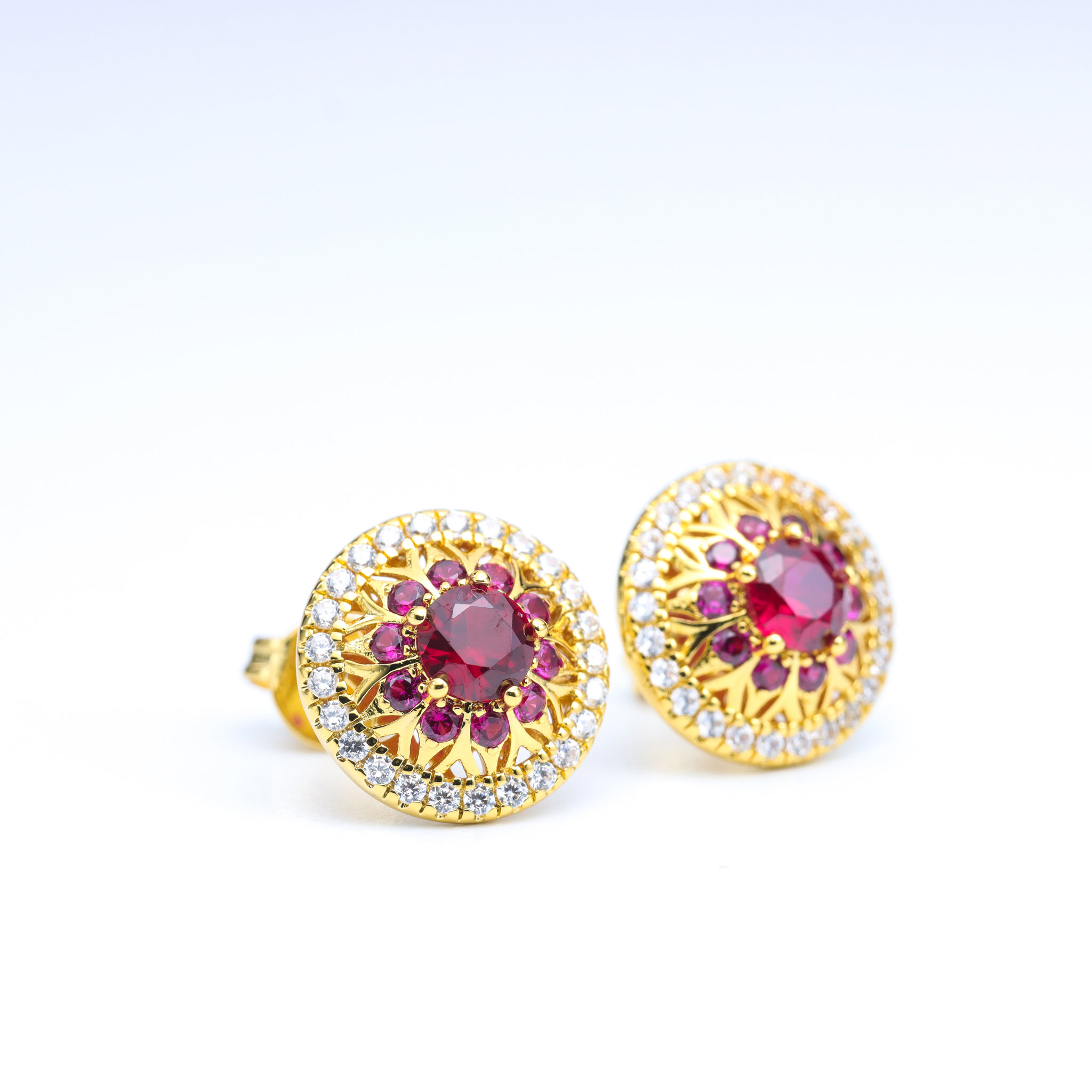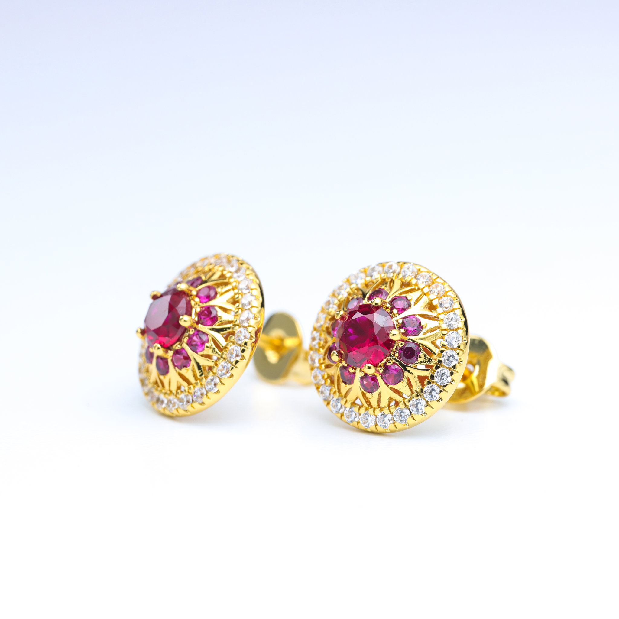 These vintage-inspired stud earrings feature a radiant round lab-created ruby at the center, framed by a double halo of sparkling cubic zirconia. The warm 18K gold plated setting and intricate openwork design create a classic, retro feel that is elegant yet eye-catching.
